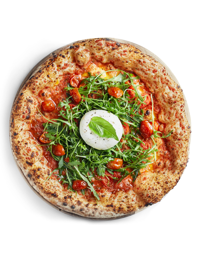 Sauce tomate, mozza, tomates cerises, roquette, burrata, basilic , huile d'olive extra vierge, origan