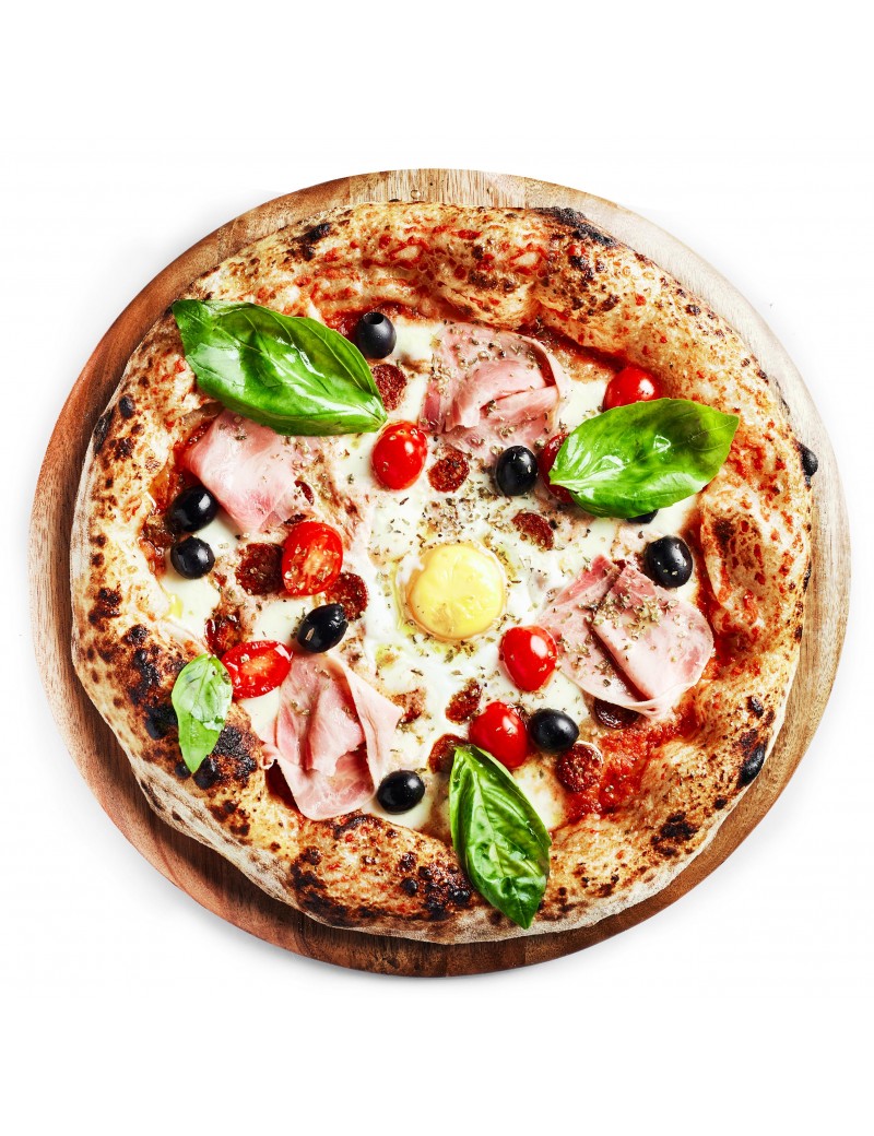 Sauce tomate, mozzarella, merguez de boeuf jambon de dinde et oeuf