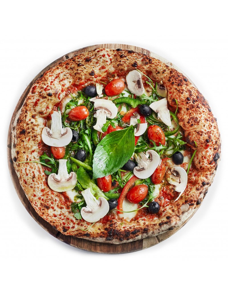 Sauce tomate, mozza, artichauts marinés , tomates cerises, olives noires, poivrons et champignons
