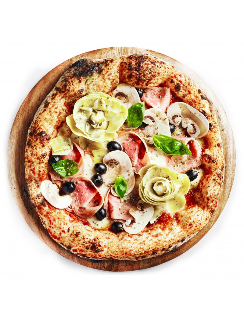 Sauce tomate, mozzarella, jambon de dinde, champignons, artichauts marinés et olives noires, origan![]()
